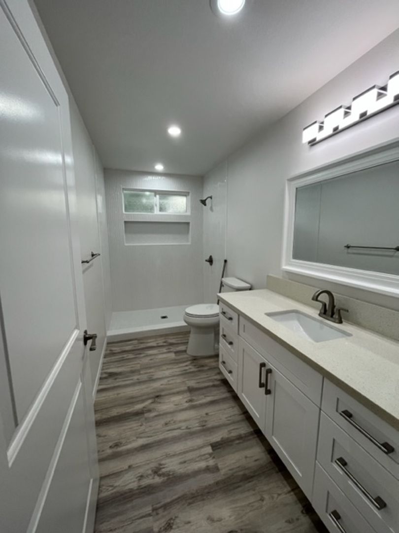 Features include split AC, white cabinets, quartz countertops, stainless steel appliances, pantry, tile and vinyl plank flooring, ceiling fans, & automatic water sprinklers.